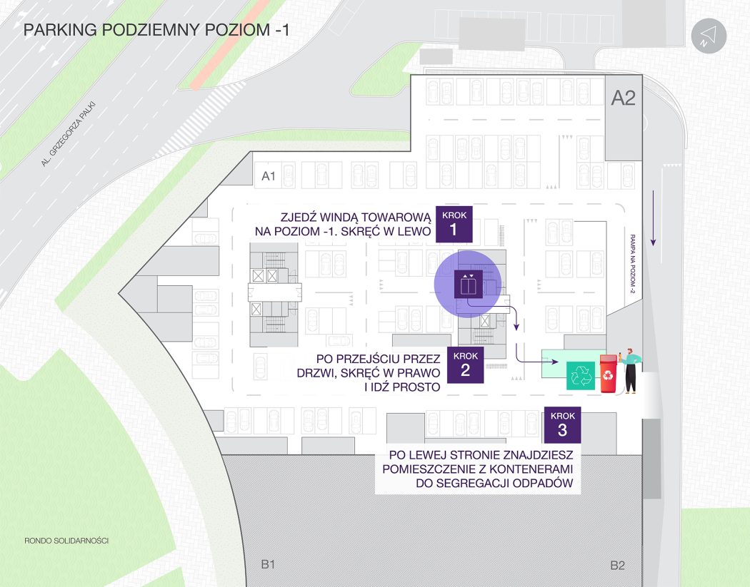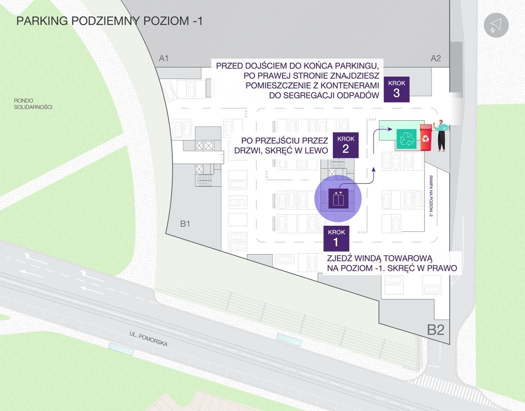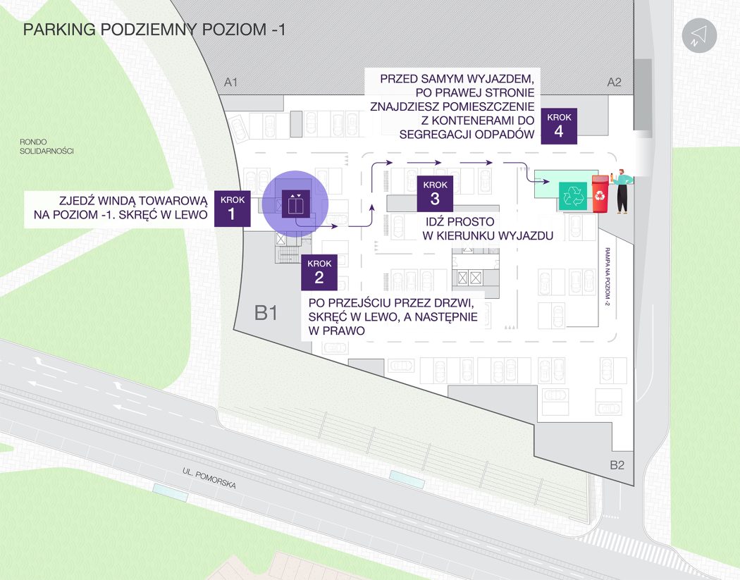Stawiamy na ekologiczne rozwiązania i takiego podejścia oczekujemy też od Ciebie – prosimy o sortowanie odpadów zgodnie z obowiązującymi wytycznymi. Gdzie je wyrzucać? Kontenery na śmieci znajdziesz na parkingu podziemnym w wydzielonych pomieszczeniach. Dojście do nich jest pokazane na planie poniżej.
